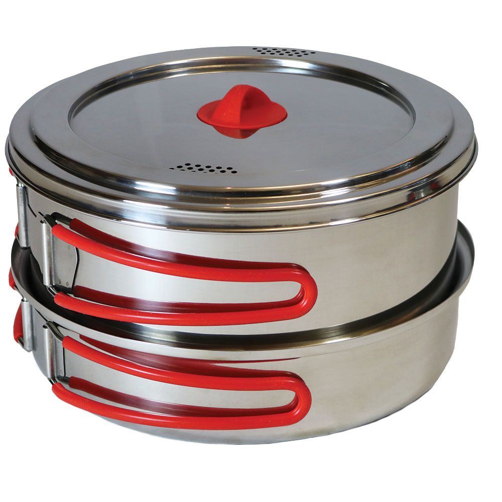 This cookset is made from stainless steel including the swing-out handles which feature silicone covers to keep them cool to the touch. The set includes 3 pots and a frying pan as well as a unique lid that fits all 4 pieces, has drain holes incorporated into it, and has a stay-cool silicone knob. It all nests together and comes with a mesh bag for convenient storage.