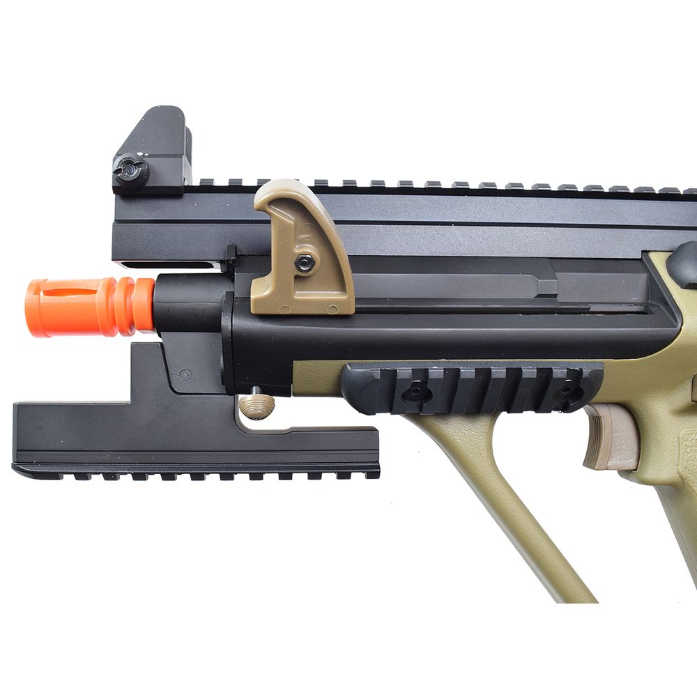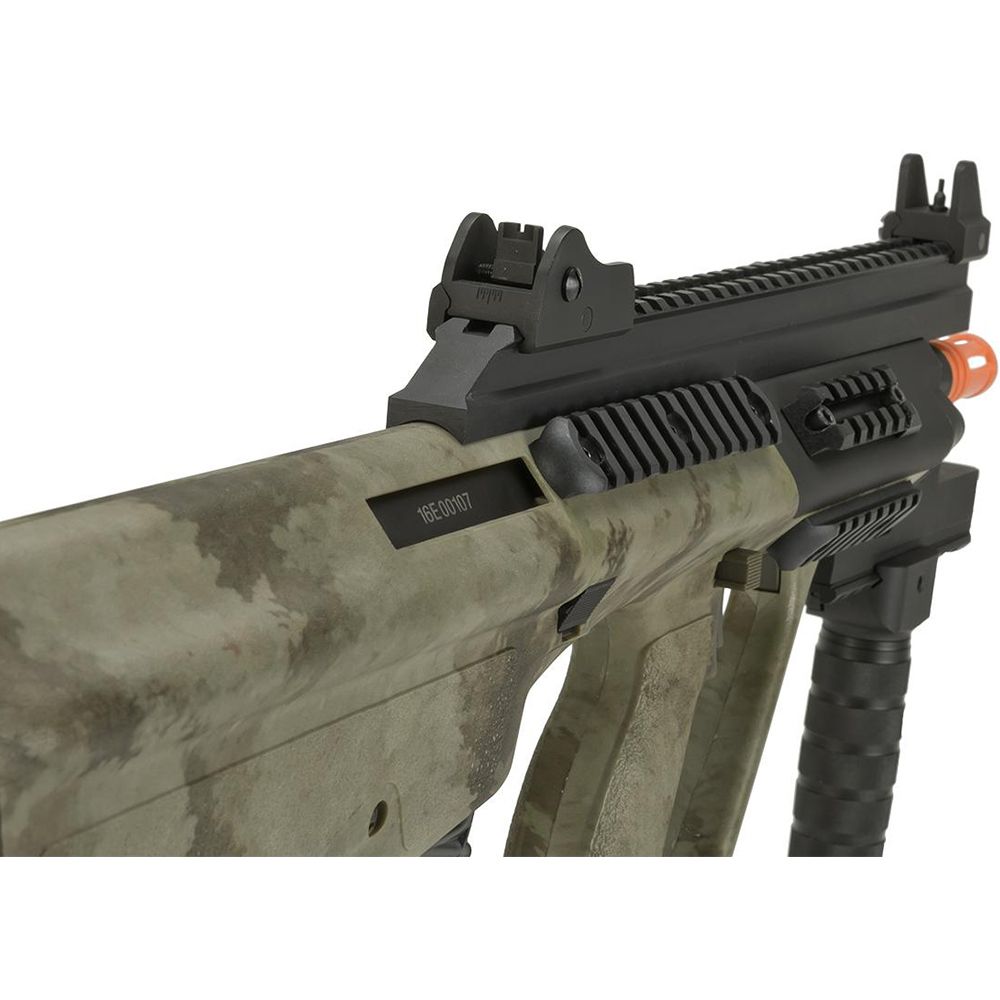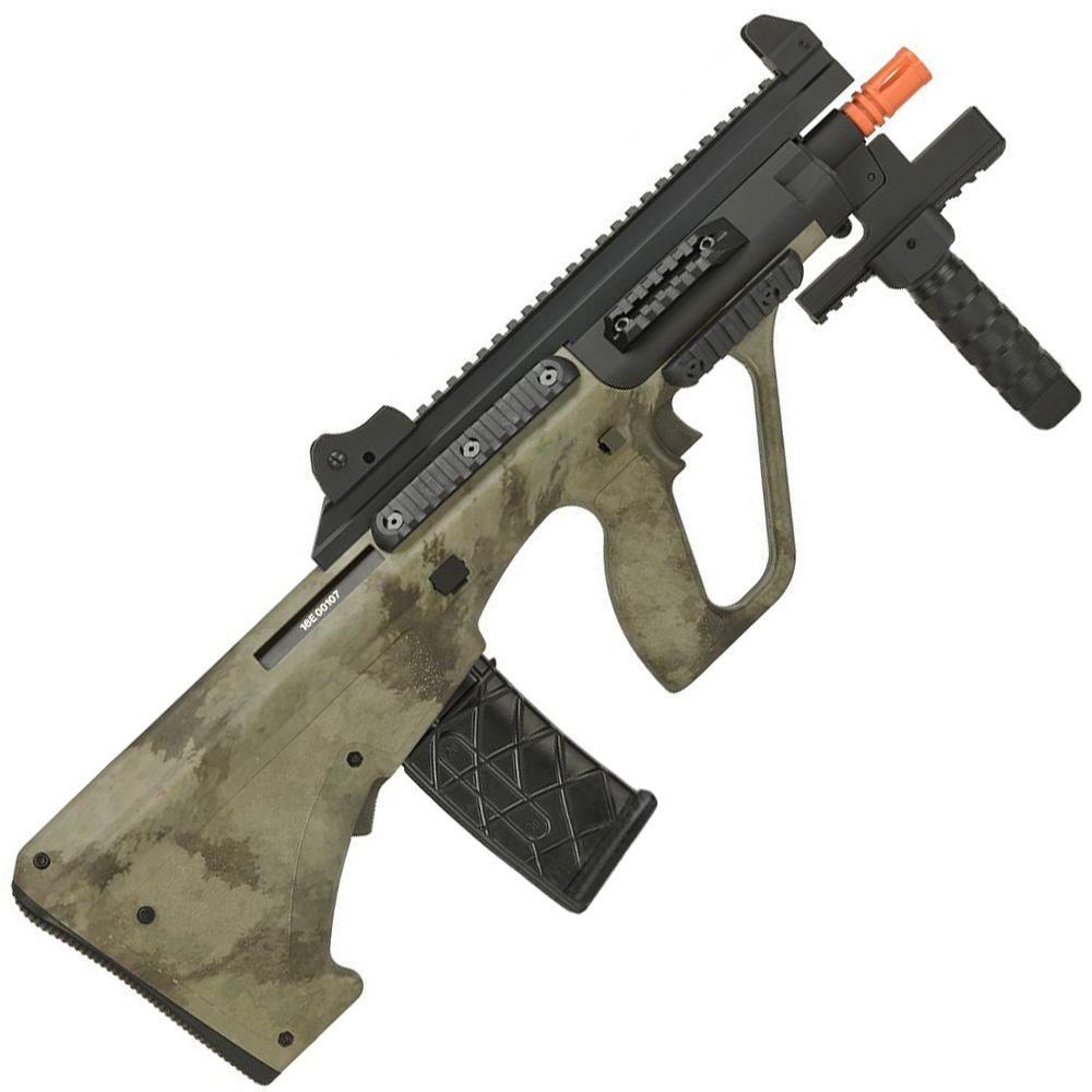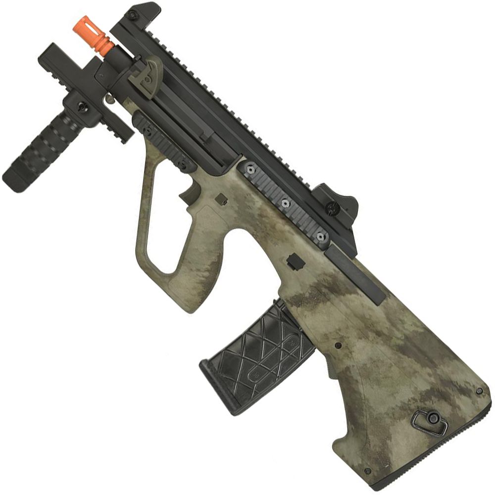 The Steyr AUG A3 XS Commando AEG Airsoft Rifle is a small but powerful electric rifle designed to pack a serious punch on the airsoft field. The fully ambidextrous bullpup airgun shoots 6mm airsoft BBs out at up to 400 FPS and comes with an adjustable hop-up system, V3 metal gearbox, and 7 accessory rails (5 are removable) for attaching a scope or laser. Overall weight is 3.4 kg (7.5 lb).