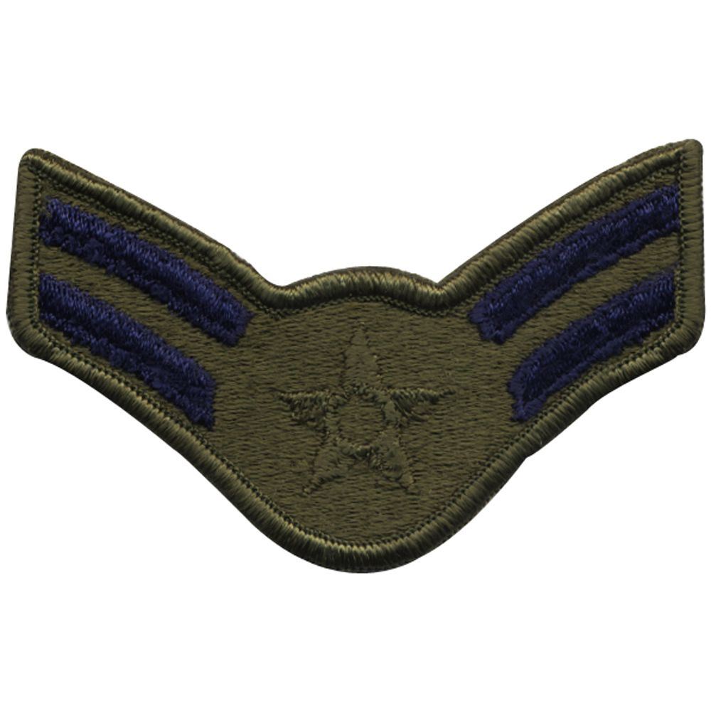 This is an iron on/ sews on/ glue on based military embroidered patch which is a replication of the original military patch. This subdued colored patch has two downward pointing chevron embroidered in blue color on an olive drab background. It also has an encircled star at the tip of the chevron. This kind of patch signifies rank of personnel’s. You can get these patches at very reasonable cost. It comes in a standard size of, 7/8 inches in length and 2 ½ inches in breadth. These subdued patches are sold in pairs and made in USA.