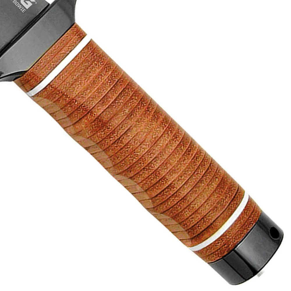 The SOG SB1T-L Super Bowie Survival Knife is a new adaptation of the original SOG Bowie that was introduced when the company started. This is a big knife for handling big jobs. The blade is 7.5 inches long will stun you with its precise construction and grind lines and made from very sharp AUS8 Stainless Steel and is in a new large format. The SOG black TiNi coating is great as usual for corrosion protection and is very scratch resistant. At 0.25 inches thick this blade isnât going to bend on you if you need to pry things open. However at almost 13 inches long this survival knife can be clumsy to carry on your side, so be sure you want a big honking Survival Knife if you decide to buy this one. The blade shape and construction are great SOG quality and this knife wonât let you down if you have some heavy duty jobs lined up for it. This knife is rather heavy at 17.4 ounces so keep that in mind. Unlike the original, all parts are protected with hardcased black TiNi coating for best appearance and performance. It retains its roots with stacked leather washer handle and overall design.