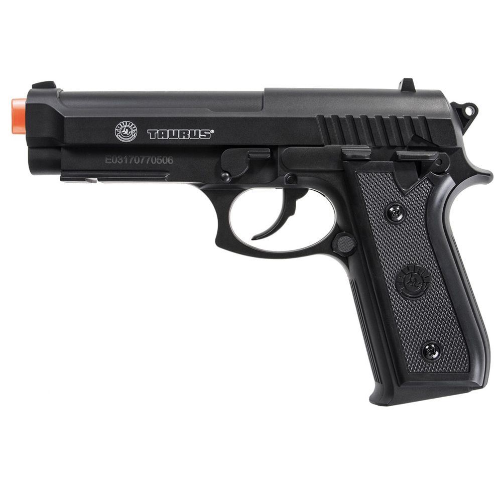 The Cybergun Taurus PT92 airsoft pistol makes a reliable sidearm on the battlefield. Originally made as a spinoff of the Beretta 92, the PT92 features the same iconic open barrel design with a beavertail grip and round trigger guard. This airsoft replica has a light-weight molded polymer construction with a fixed slide and few moving parts, making upkeep and maintenance clean and simple. Authentic Taurus trademarks can be found engraved on the slide and in the textured grips. The lower tactical rail allows you to upgrade your setup with a laser sight or flashlight mount.Features:Type: airsoft pistolPower: co2Material: polymerOverall Length: 213 mm (8.4 in) Weight: 467 g (1.03 lb)Action: semi-automaticTrigger: double actionBlowback: noMagazine Capacity: 13 roundsAmmo Type: airsoft BBs 6mmMuzzle Velocity: 377 FPS