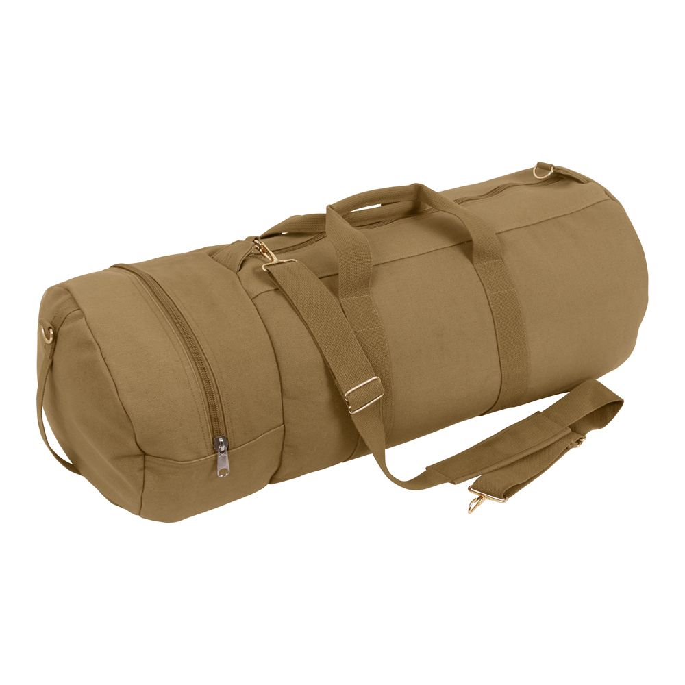 The Canvas Double-Ender Sports Bag features a heavyweight canvas material. The bag has a 6 1/2 Inch extension end pocket and a 5 1/2 inch internal pocket. Additional features include a detachable shoulder strap and sturdy canvas carry handles. This canvas bag is great for long trips and sports equipment.