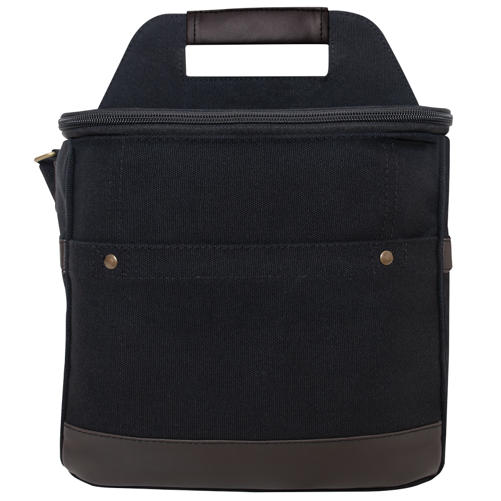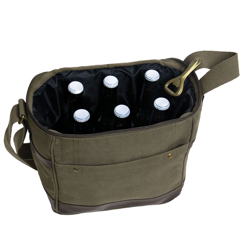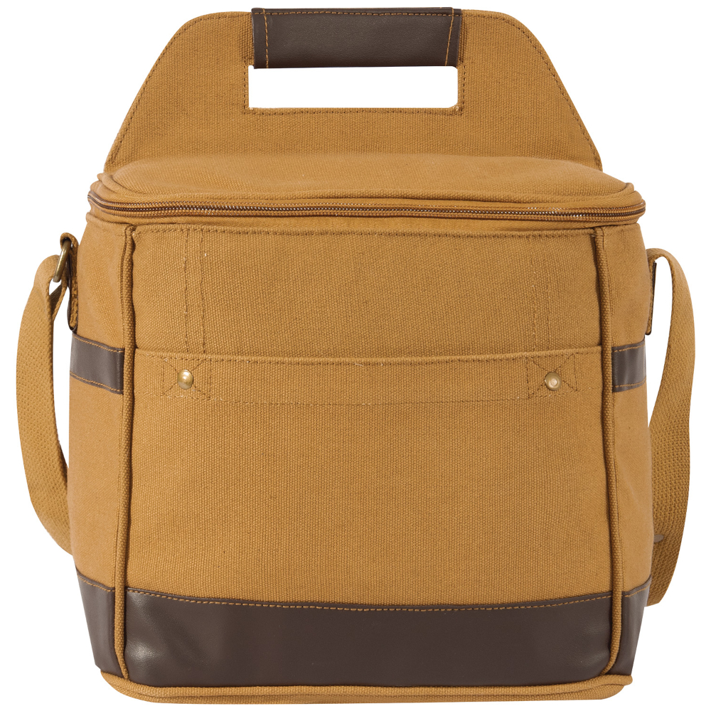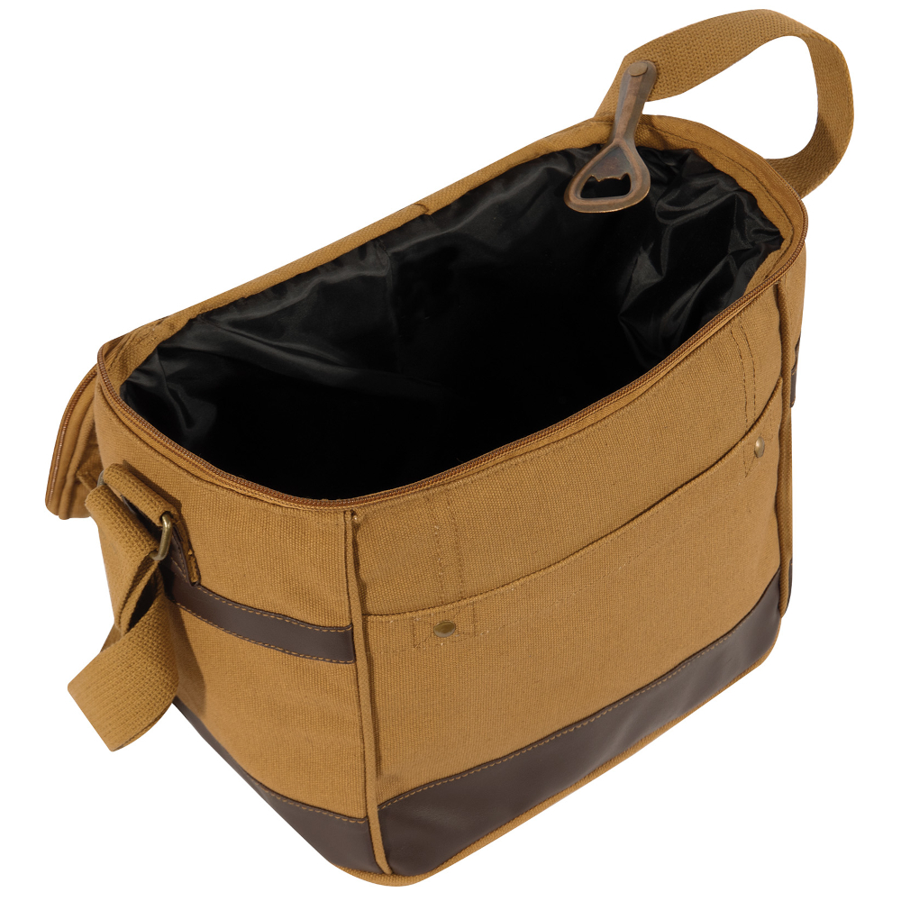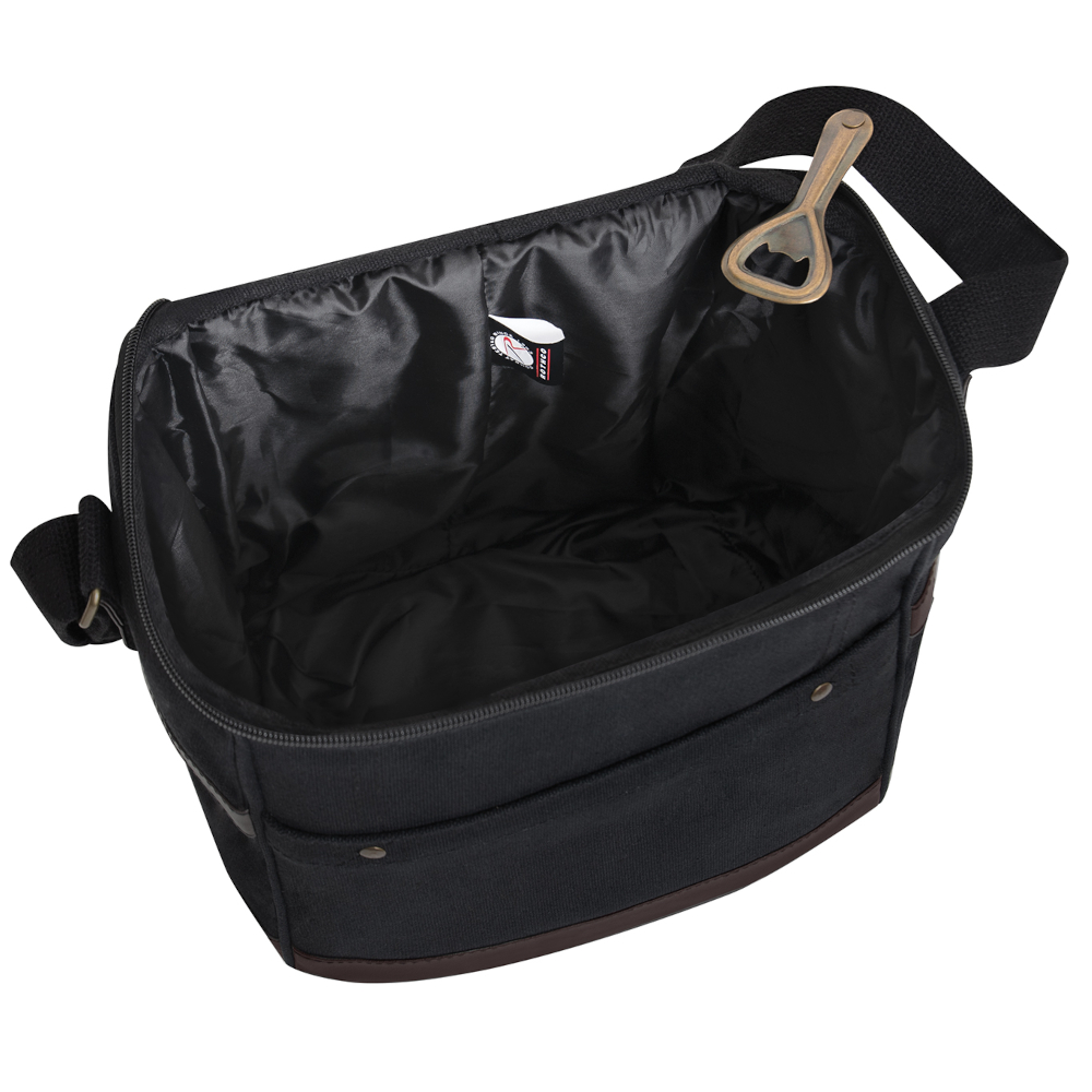 Keep food and drinks cold all day long in Canvas Insulated Cooler Bag. This beer cooler is made from 100% 22oz cotton canvas and foam insulation to keep drinks and food cold. The cooler bag has a 54-inch shoulder strap with a brass colored bottle opener attached as well as a top carry handle for easy carrying. Measuring at 10-inches by 10-inches by 7.5-inches, the insulated bag can fit up to a six-pack securely. Additionally, there is an open top pocket on the front of the cooler for storing extra gear. Vinyl leather accents complete the look for the Canvas Insulated Cooler Bag.