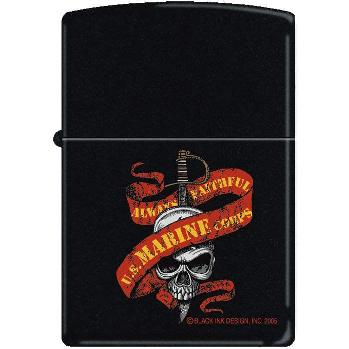 Made in USA. One of a kind stylish od green colored zippo lighter. U.S. MARINES CORPS ALWAYS FAITHFUL printed in gold lettering inside a red ribbon on front of lighter. Marines skull ribbon logo pictured on front of lighter.