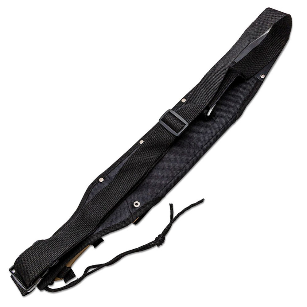 Officially licensed by the USMC, the Desert Ops Gladius Sword embodies the fighting spirit of the Marines with its message of “Honor, Courage, Commitment.” The message is laser-etched, in white, on the desert tan, matte finished blade. There are aggressive saw serrations on the spine of the 17 3/10” stainless steel blade, which are just above the handguard. The grippy handle has ridged ABS handle scales secured to the full tang with heavy-duty screws and it features a sharp, extended point pommel. The 24” overall gladius sword can be secured and carried in a tough and durable 600D nylon belt sheath that has an adjustable shoulder strap for carry.