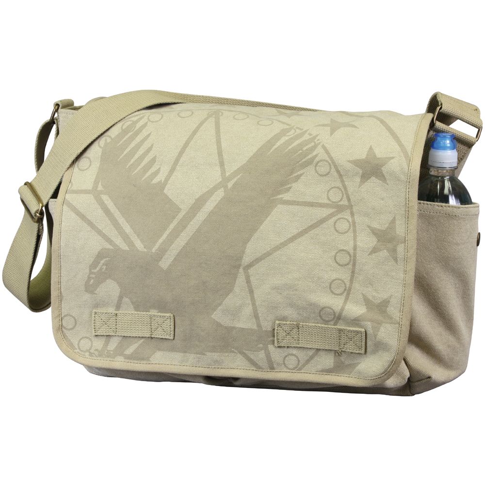 Rothco Vintage Canvas Messenger Bag Features A Stonewashed Cotton Canvas In Khaki With Subdued Army Eagle Print. The Messenger Bag Features AN Enormous Main Compartment With Inside Zipper Pouch, 4 Outside Pockets, Brass Hardware and 2'' Wide Adjustable Shoulder Strap.