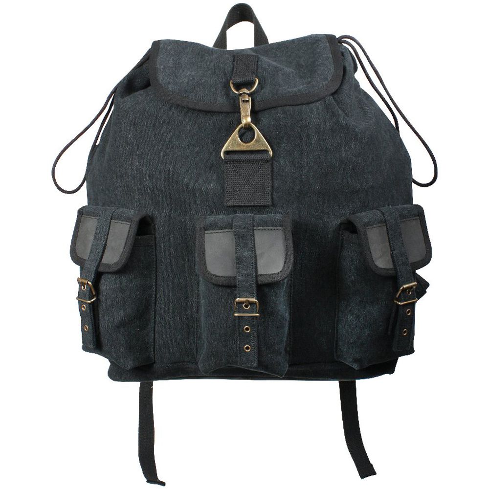 Vintage Canvas Wayfarer Backpack with Leather Accents features a heavy weight cotton canvas, leather bottom, large main compartment with top flap, drawstring top, 3 pockets with leather flap & antique brass closure.