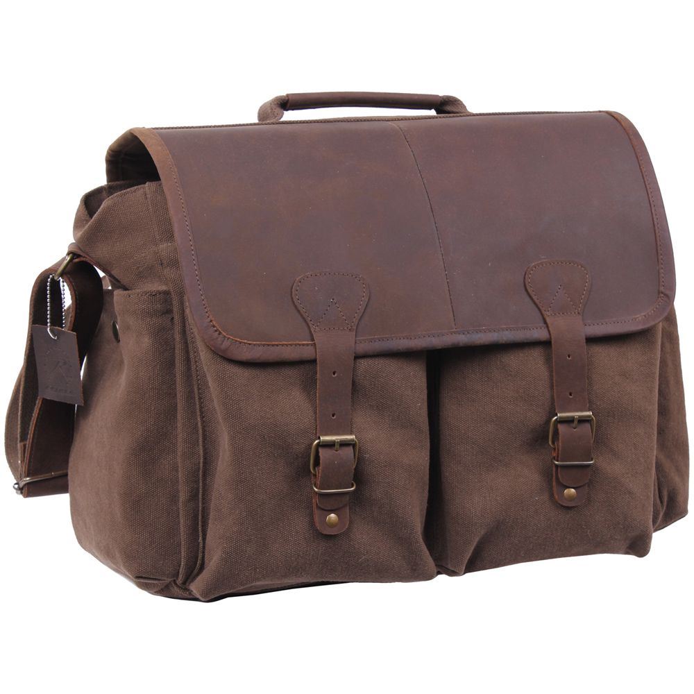 Material Specs: Heavyweight Cotton Canvas, Leather Front Flap Dimensions: 15" x 11" x 6" Components: leather front flap and shoulder strap (2" wide, 52" long Closures And Fasteners: Flap No. In Master Carton: 12 Weight: 2.3