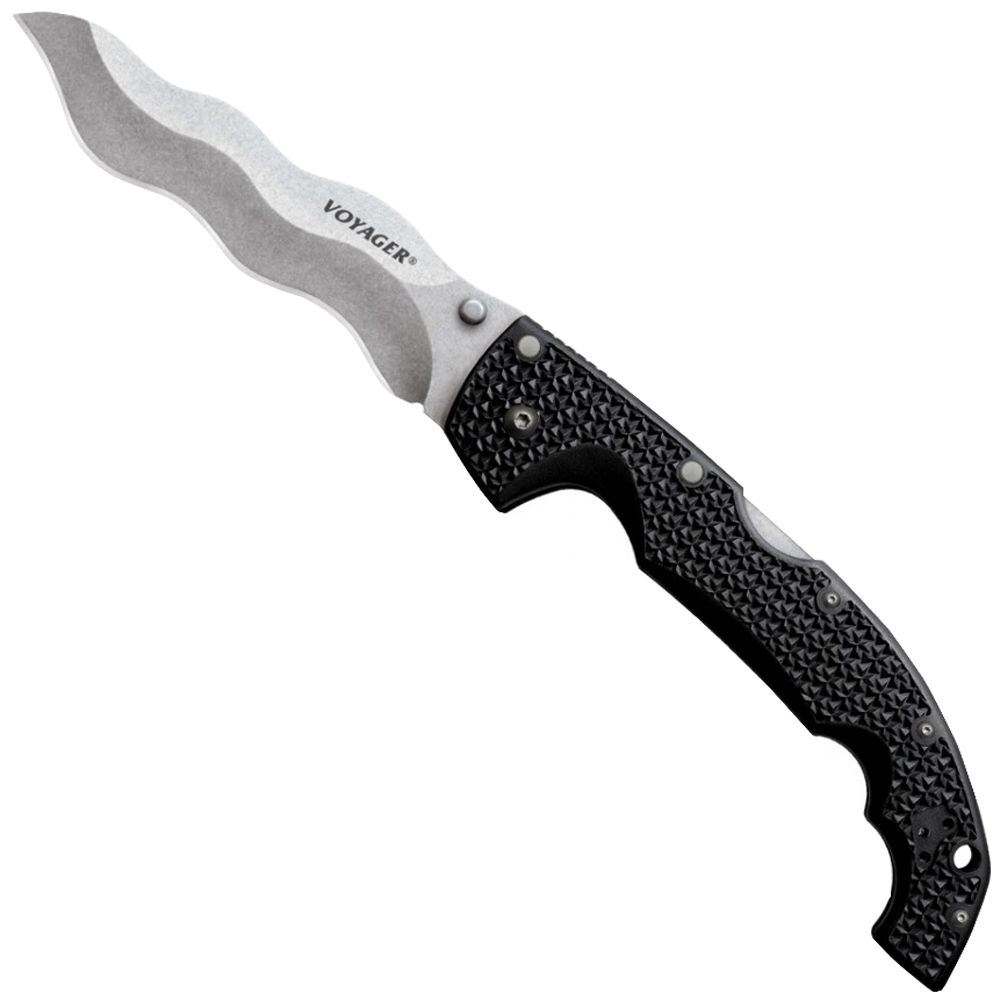 The Cold Steel Voyager series is designed to be the true “everyman” knife. Lightweight, comfortable, super sharp, they are rugged, dependable and perfect for hunting and camping as well as general utility and daily cutting chores. The Voyagers excel in many survival and rescue applications, and they have proven to be very popular with Police and Military personnel, who appreciate the combination of cutting performance and safety that they offer. They are precision engineered and held to our most exacting standards. Featuring AUS 10A blades, and our Tri-Ad locking mechanism - which is quite possibly the most secure, safe and shock resistant lock on the market today! The ergonomic Griv-Ex™ handles (reinforced with heat treated 6061 aluminum liners) provide great comfort and a secure grip even under extended use in tough conditions. New to our line up is an iconic Kris blade Voyager inspired by the fabled blades of Southeast Asia. It offers a wide, thick serpentine shaped blade that cuts and slashes with particular efficiency due to its razor-sharp undulating edge.