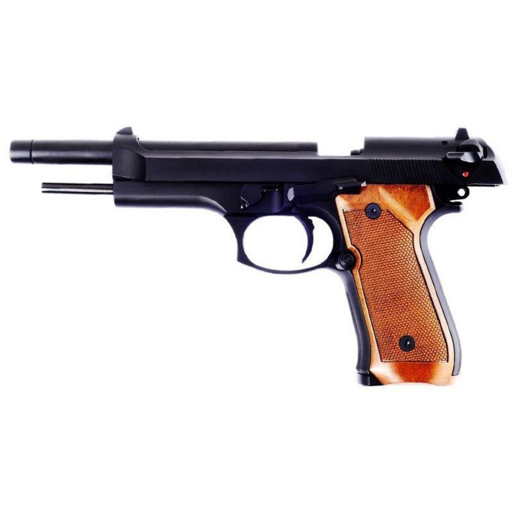 This WE variant is based on the original technical drawing and modularity of the original M9 platform. Ultimately, this pistol features the same modularity and design of the standard WE M92; realistic weight, full metal build, plastic textured grip, hard kicking blowback action and the highly reliable slide lock. The only difference is that this model exceptionally comes with an extended inner barrel and slide that allows it to cock at a higher FPS and add more range to your target than the smaller version. The front and rear sights are done professionally and finished with the quality you would expect from WE. The pistol simply feels great in the hand and function exactly like the real firearm. Moreover, the matte black finish in combination with its sliver slide gives it a very spectacular and eye catching look instantly turning it to Airsoft Royalty.