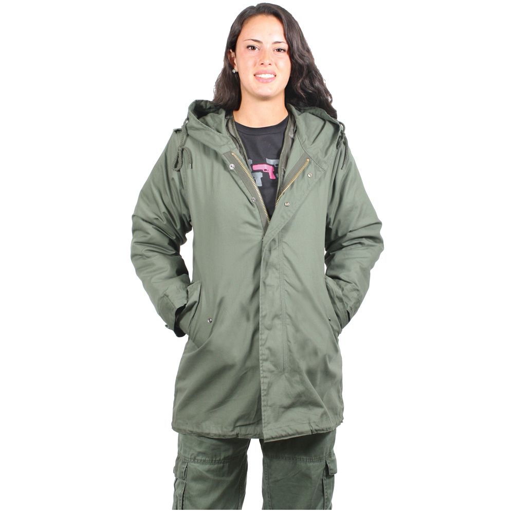 Women, who have to be outdoors will love this olive drab wear, made of a very durable material. Not only does it look great, it also offers effective protection in an inclement weather. Some of the features it has are: a brass zipper with a snap flap; a hood with drawstring; and a snap up back flap. The button down epaulets lend it a more formal look. This wear is excellent if you are on a trek, or even on a bike, as it gives maximum protection from the elements. Easy to handle and store, it can serve you for many years.