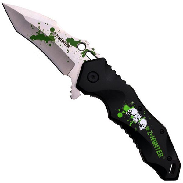 Prepare yourself for the Zombie apocalypse with the Z-Hunter Folding Knife! This impressive folder features a satin finished tanto blade with a faux blood splash accent. The black anodized handle has formed palm and finger grooves for a comfortable grip.
