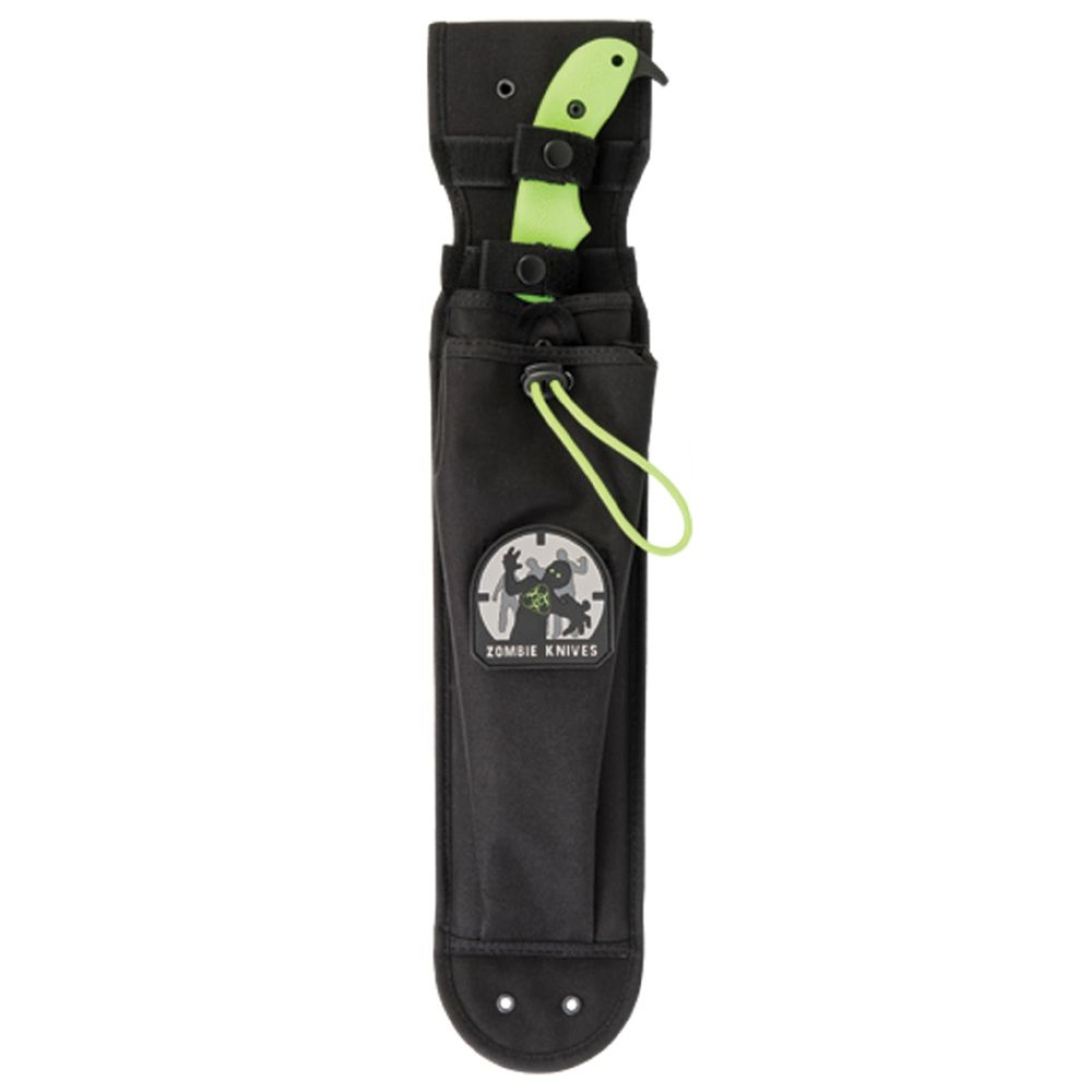 Knife comes mounted with toxic green handles. Extra set of black scales and Acheron Skeleton Knife (only) included. Zombie patch included, mounted on MOLLE compatible sheath.